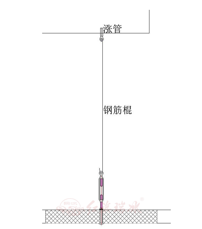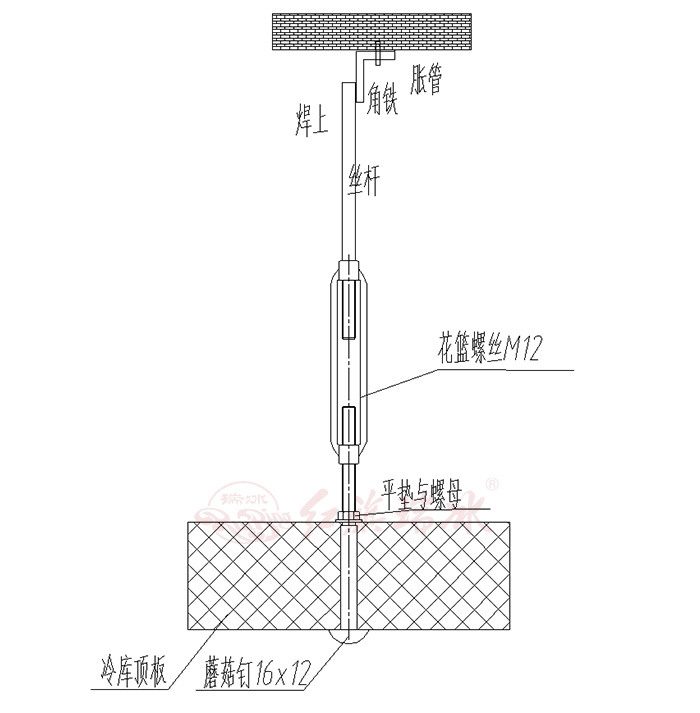 裝配:吊頂方式主要通過鋼筋棍實(shí)現(xiàn),蘑菇釘穿過頂板與吊環(huán)連接,吊環(huán)掛在花籃螺絲上,鋼筋棍與花籃和脹管相連。吊頂方式通過花籃調(diào)節(jié)從而控制吊頂?shù)木嚯x。